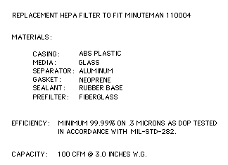Minuteman has replaced HEPA Filter 110004 with ULPA Filter 110029. For a replacement ULPA Filter for the 110029 go to 6286H7. ![]() |